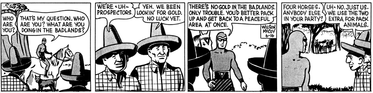 In short, our choice to emphasize Wilson McCoy’s strips is guided by two factors: first, that complete runs of these stories, in their full format, have never before been reprinted; and second, that the years when Falk and McCoy collaborated were, in my view, among the most formative in the history of The Phantom. During this period the legend of the character expanded: the Jungle Patrol was introduced, the Monkey Mail appeared, and the dual marks of The Phantom—both the Good Mark and the Skull Mark—became central to his mythology.